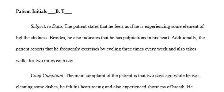 Walks 2 miles daily and rides an exercise bicycle 3 times a week; has previously felt the palpitations associated with exercise that usually went away with rest; 2 days ago while washing dishes he began to feel shortness of breath and felt that his heart was “racing”; He hoped the palpitations would go away but they have continued and that is why he is here today.