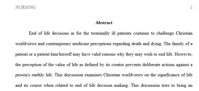 Based on “Case Study: End of Life Decisions,” the Christian worldview, and the worldview questions presented in the required topic study materials you will complete an ethical analysis of George’s situation and his decision from the perspective of the Christian worldview.