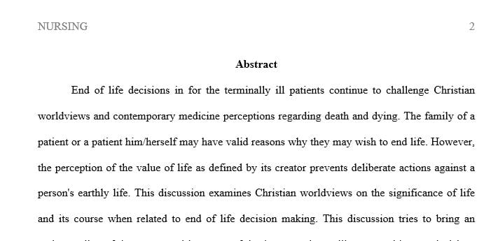 Based on “Case Study: End of Life Decisions,” the Christian worldview, and the worldview questions presented in the required topic study materials you will complete an ethical analysis of George’s situation and his decision from the perspective of the Christian worldview.