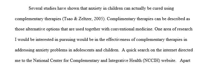 Complementary therapy has long been used in the treatment and management of various mental conditions. One of the areas that is still under research is in the treatment of childhood anxiety. As such, there is a need to discover the effectiveness of complementary therapy in childhood anxiety compared to using medication alone.