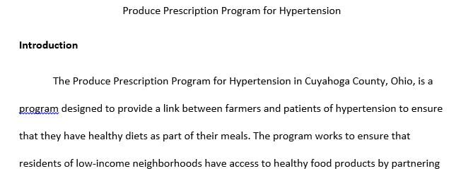 The Program that needs to be evaluated is the Produce Prescription Program for Hypertension in Cuyahoga County, Ohio. A little detail about this program is that Partners in Cuyahoga County, Ohio, developed the Produce Prescription Program for Hypertension to connect residents in need to healthy eating information and resources. Over 600 low-income patients with high blood pressure have better access to nutrition education and affordable produce.