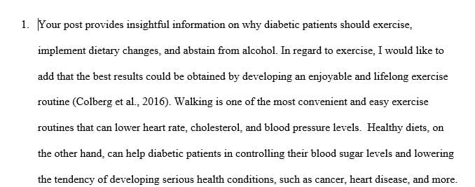 1. The older diabetic patient discussed in week two project had the following preliminary issues: hypertension, arthritis, and visual impairments. His wellness program hence will provide supervised exercises, patient and family education and support throughout his journey, while also implementing lifestyle changes. The community center was well suited for supervised physical exercises. Supervised physical exercises are effective measures to improve muscle metabolism, and maintain strength (Seene, & Kaasik, 2012). Additionally, exercises have been reported to increase insulin sensitivity and aid in the achievement of improved glycemic control. Other benefits include better weight management, reduced blood pressure, and the risk of cardiovascular disease. Even though exercises are encouraged, the patient will be advised to discontinue boxing and change to non-impact sports due to the ongoing treatment for arthritis.