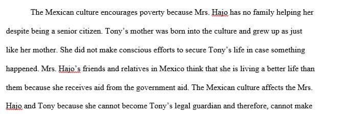 Discuss one aspect of your client’s culture that you think has had an impact on your case:Mrs. Harjo and Tony: Mrs. Harjo is 65 year old female who identifies as Latina. She lives in Globe, Arizona, and subsists on Supplemental Security Income, SNAP (Supplemental Nutrition Assistance Program, commonly known as food stamps), and her garden. Mrs. Harjo has been living alone since the death of her husband five years ago. She is the daughter of Mexican immigrants, and visits her hometown in Mexico for Semana Santa every other year.