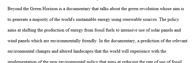 Pretty simple paper: choose and watch a documentary or video on a relevant Environmental Health Policy and write a report about the topic, presentation, experience, and lessons learned.