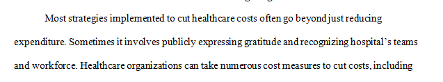 In this assignment, you are the CFO of a hospital, and you will create a one-page memorandum detailing cost-cutting measures that will be undertaken in response to the COVID-19 (or similar) crisis. You will consider debt financing, variance analysis, and cost variances in the organization. You need to translate your analysis results into practical action steps the organizations and employees will take.