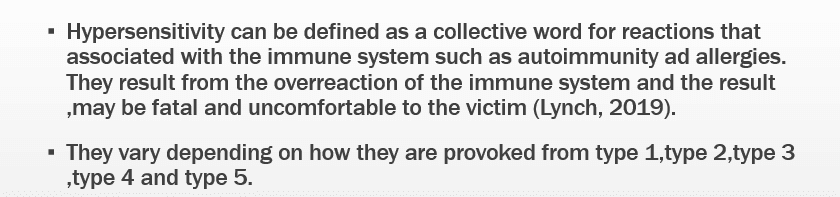 Example. Hypersensitivity- Pathophysiology, diagnosis/diagnostic tests, clinical manifestation (Complications), treatment, health promotion/teaching.