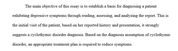 The purpose of this paper is to read, assess, and analyze a patient presenting with depressive-like symptoms. The patient presents as a first initial visit. Her presentation and reported history suggest a diagnosis of a cyclothymic disorder and an appropriate treatment plan must be created based on the diagnosis assumed. Discussion: Read, assess, and analyze a patient presenting with depressive-like symptoms.