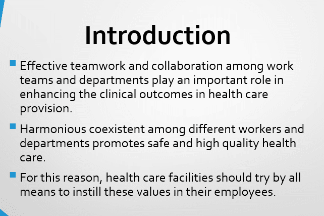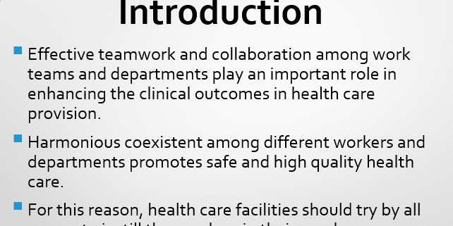Imagine you have each been promoted as part of a new management team for a long-term care facility. During the past two months, you have noticed an increase in conflicts between your co-workers and other departments, such as pharmacy or dietary. Your boss sees this as an issue and has asked your management team to find a solution.