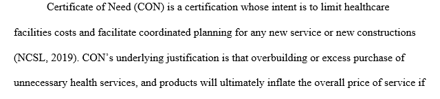 Read the Certificate of Need: State Health Laws and Programs (Links to an external site.)Links to an external site. article. Determine two advantages and two disadvantages from the health care organization’s perspective for requiring a Certificate of Need (CON).  Identify 3 states that require a CON be submitted to state and regional review agencies for any new or upgraded health care facilities
