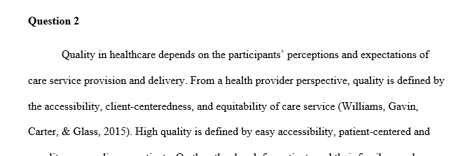 Question 2: Define what quality healthcare means from the perspective of one or more of these groups (pick 3 of below choices):